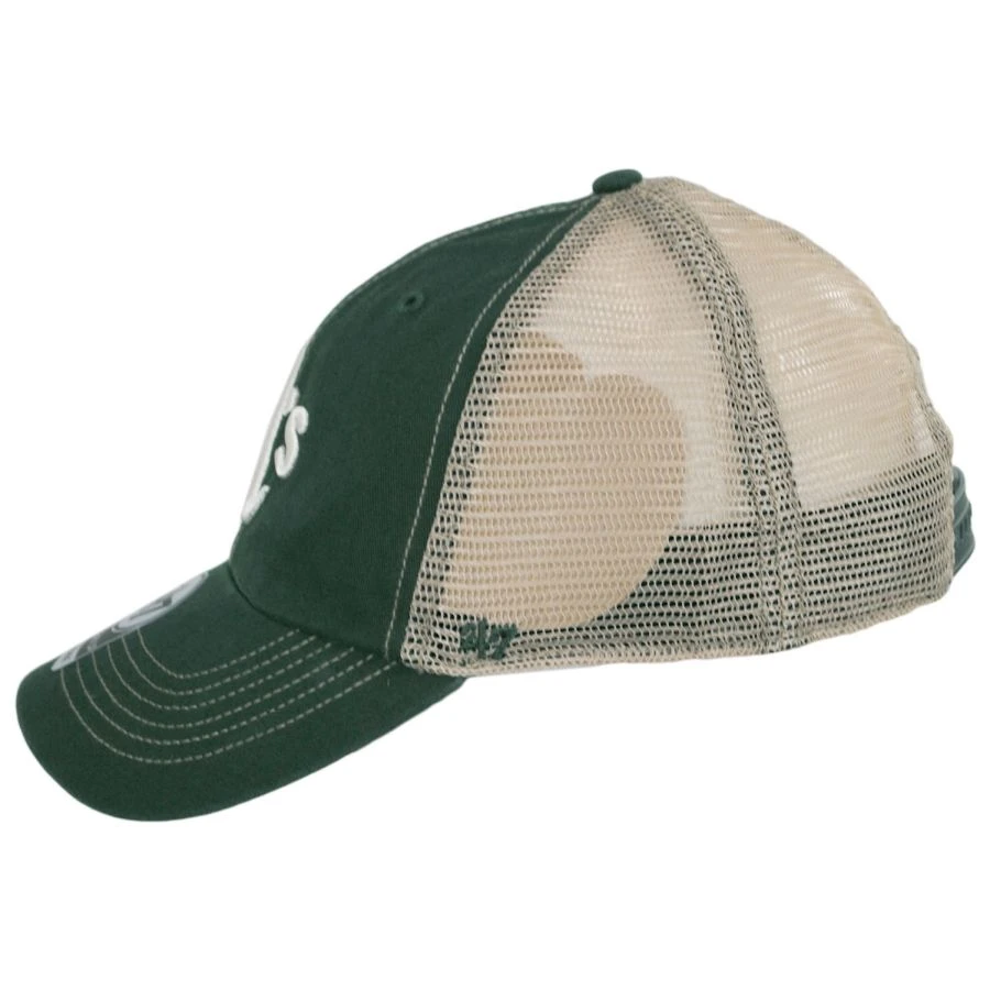 Featuring a soft classic 6-panel crown, 4 of which are mesh, the Oakland A’s Trawler 47 Mesh Clean Up Baseball Cap is all about comfort and relaxation. The front 2 panels are made of 100% cotton with a twill finish, sewn eyelets and are adorned with an embroidered logo at the front. An embroidered ’47 Brand side hit, adjustable snapback, cotton twill sweatband and inseam taping complete this easy-going baseball cap.