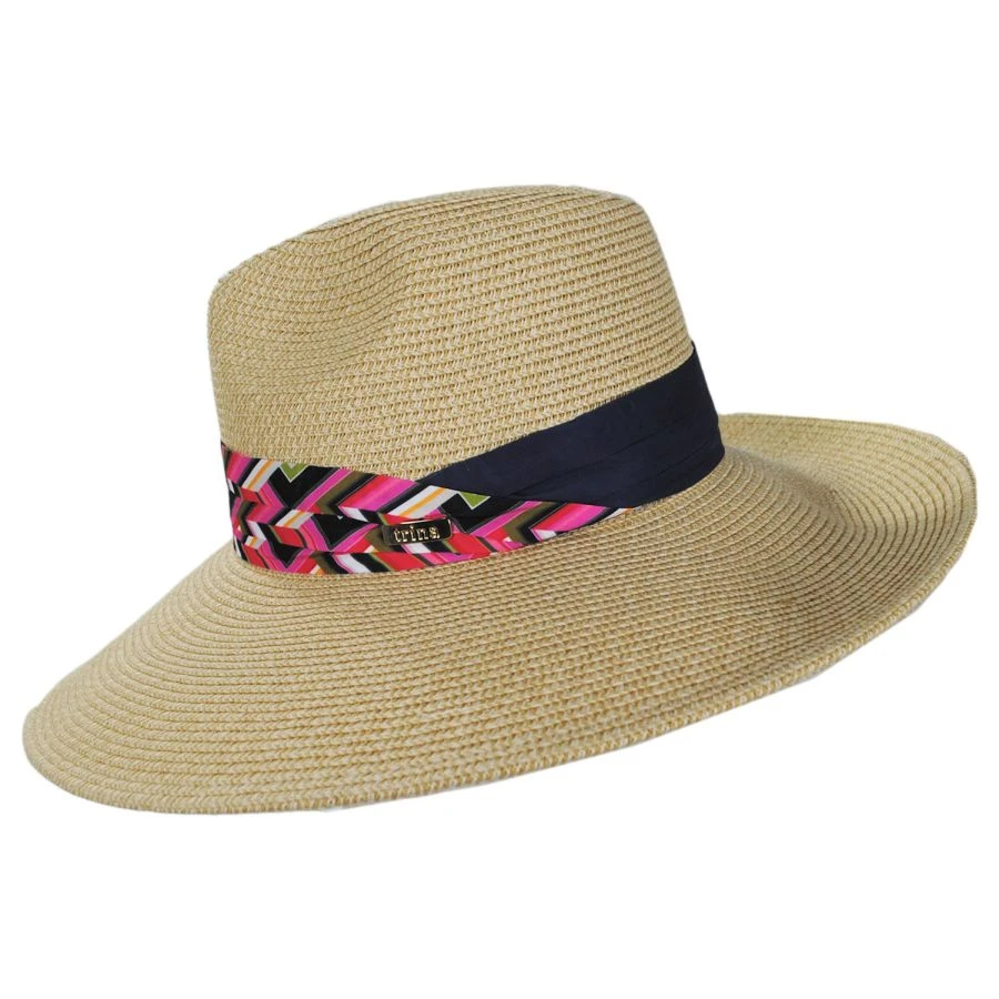 Trina Turk’s Azure Ultrabraid Toyo Straw Fedora Hat is anything but simple thanks to a statement hat band. Part of this pleated puggaree hat band sports an attractive geometric pattern, the rear section is a coordinating solid navy blue; it is also topped with a logo plaque. The body of the Azure is two-toned ultra toyo straw sewn braid and features a center pinch crown and downturned brim.