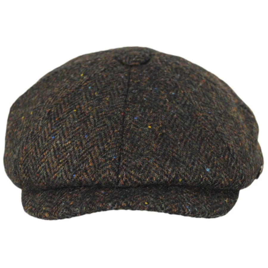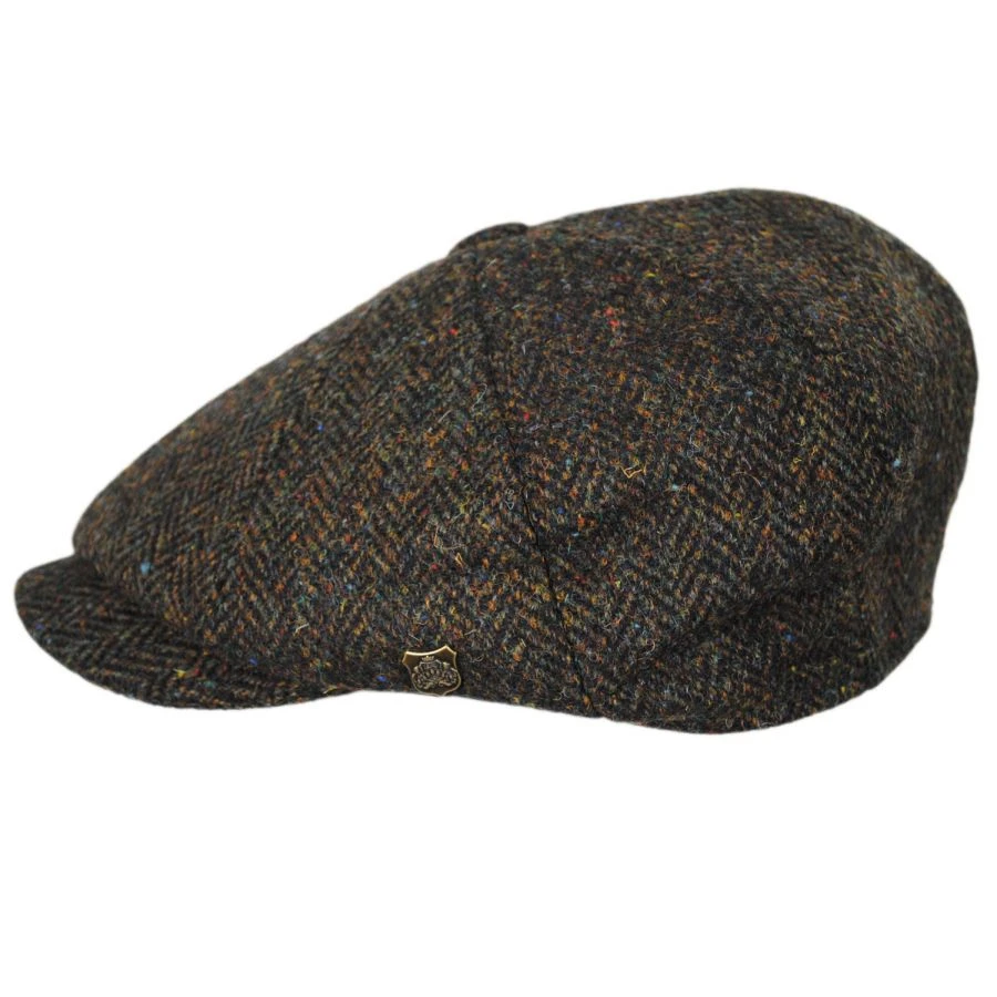 The Carloway Herringbone Harris Tweed Wool Newsboy Cap from a company with ideas from Manchester, Failsworth. Made of 100% pure Harris Tweed virgin wool that has been dyed, spun and handwoven in the Outer Hebrides of Scotland. A classic newsboy silhouette with an 8-panel design, top button and sewn bill. The interior is satin lined with a grosgrain ribbon sweatband.