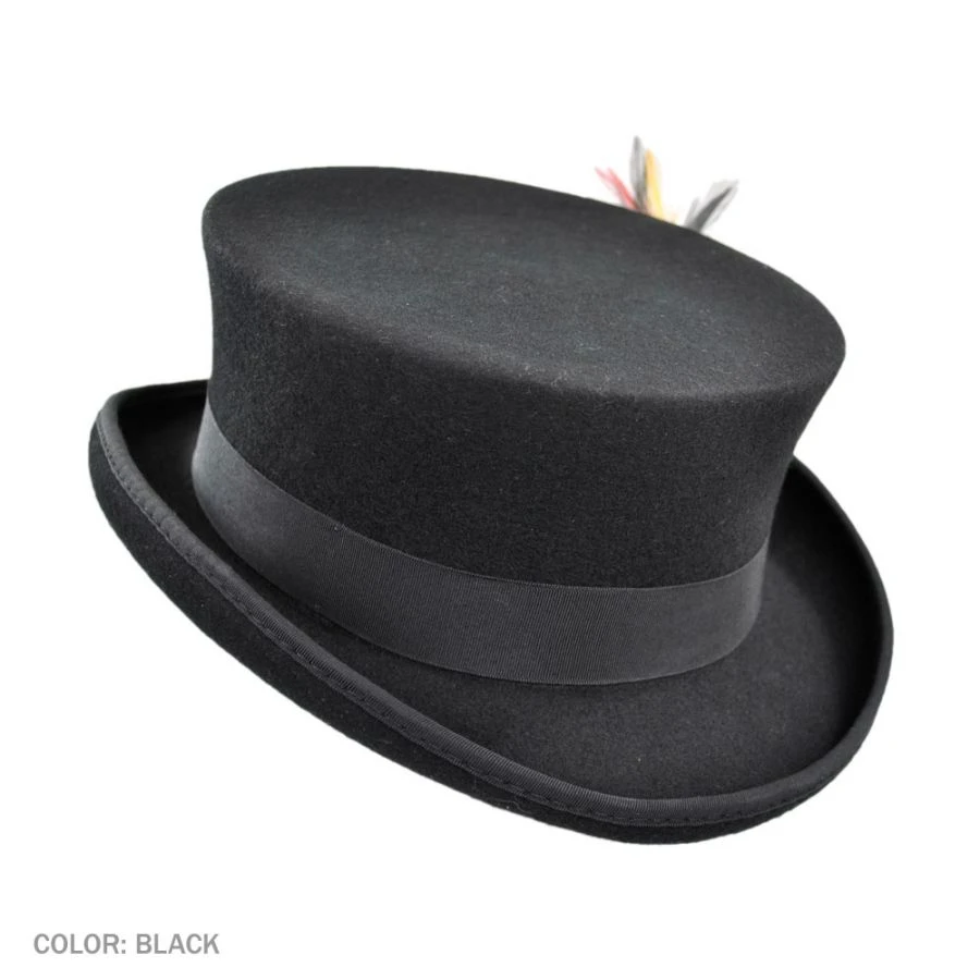 While traditionally this hat can be described as a John Bull Topper, the Jaxon Deadman Tophat was inspired by the Jim Jarmusch film “Dead Man” starring Johnny Depp. The Deadman Wool Felt Top Hat’s is extremely unique and features a short crown with an oval fit and slightly flared sides paired with a classically curled brim.