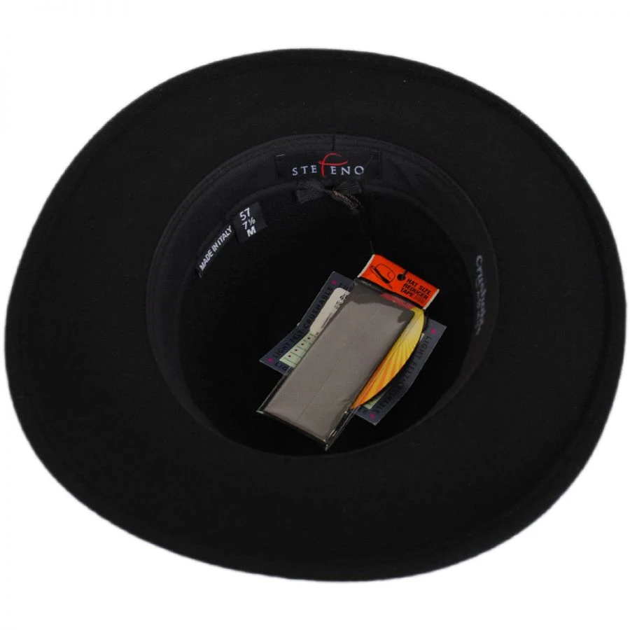 Combining the style of a classic safari style with superior Italian craftsmanship, the new Hiker Wool Felt Safari Fedora Hat by Stefeno is in a league of its own. Soft, crushable and water repellent, this wool felt boasts function in addition to good looks. Adorned with a stylish and sophisticated leather and suede hat band, the Hiker Safari will compliment your fall and winter attire beautifully.