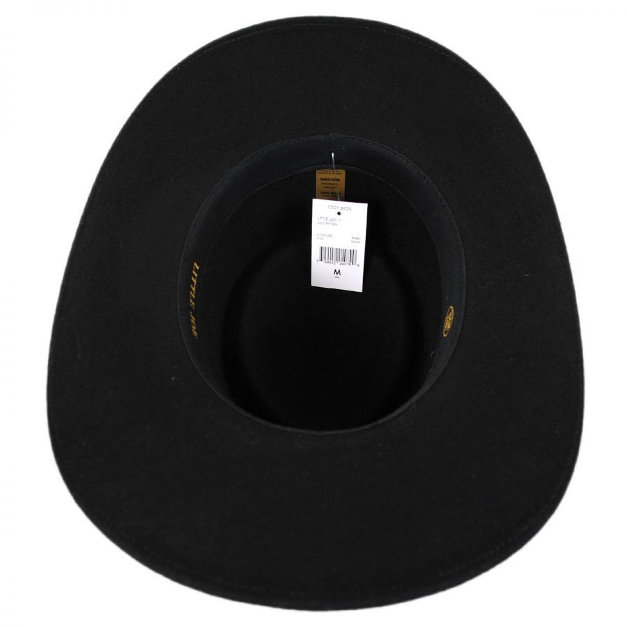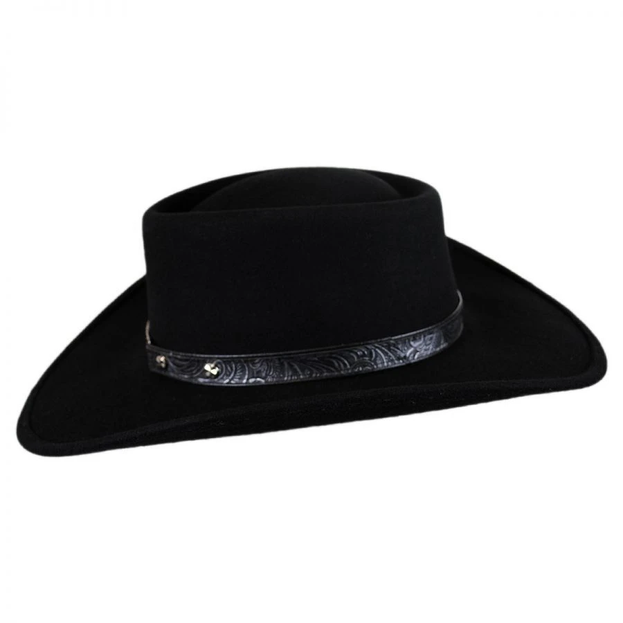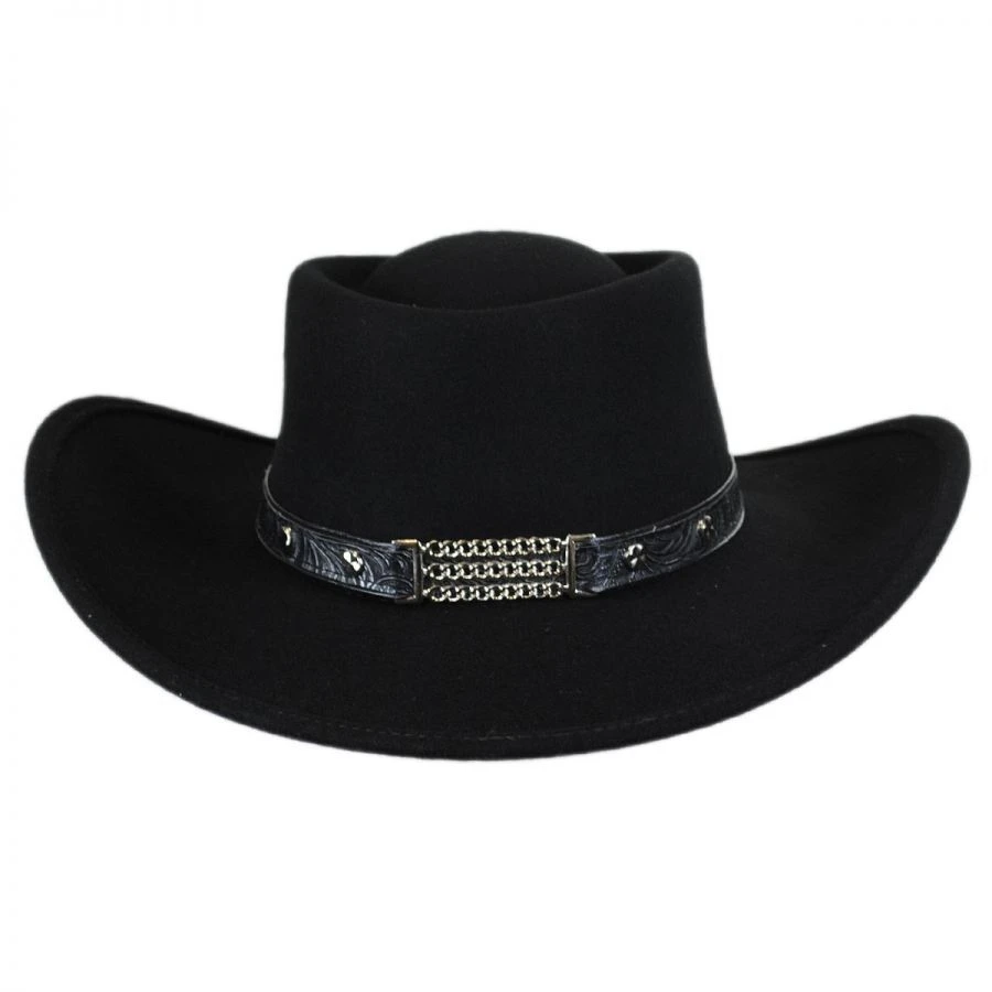 Crafted with a telescope crown and curved brim, the Little Joe Wool Felt Gambler Western Hat by Eddy Bros is not your usual western hat. Floral embossing, metal button accents and triple chain detailing at the front of its faux leather hat band give the Little Joe an edgy feel. Made with a stiff finish, the Little Joe is made to keep its stylish shape and unique look for years to come.