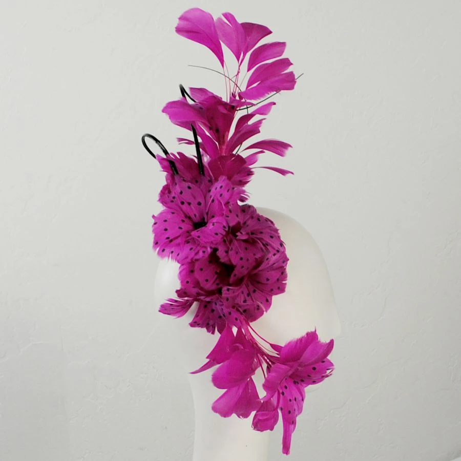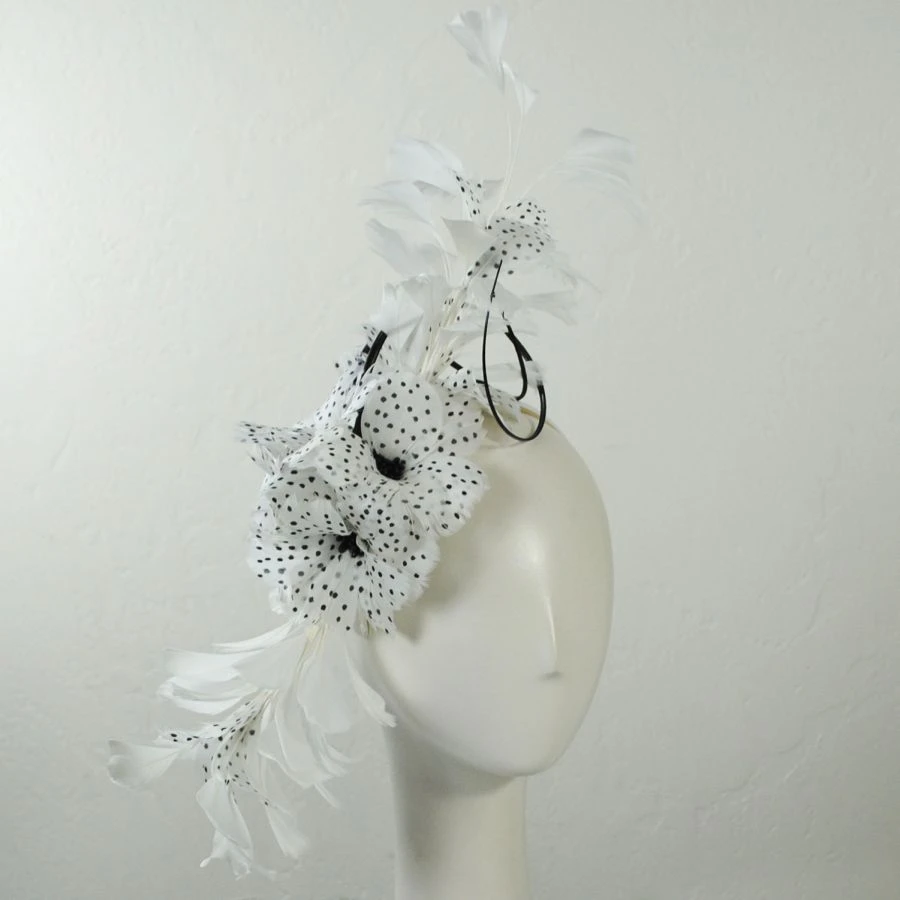 Designed by UK Milliner, Emma Linney, the Maud Polka Dot Feather Fascinator Hat from Emma B by Giovannio is a modern hit for polka dot fans. This fascinator is fun and classy, with feathers and quills. Plus, each polka dot is hand-painted! Features a satin covered headband with a grosgrain ribbon lining to ensure a secure fit.