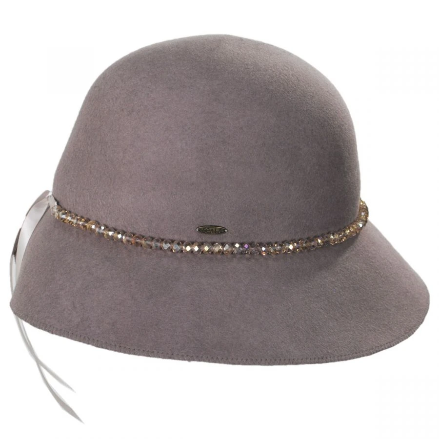 Crank up the the record player and pop on your Alessandria Wool Felt Cloche Hat by Scala, it’s time to Charleston! This ’20s styled cloche hat features a round crown, downward brim and a iridescent beaded satin ribbon hat band. The Alessandria is made of soft and completely packable wool felt. Bring the cloche into the 20th century with the Alessandria cloche by Scala.