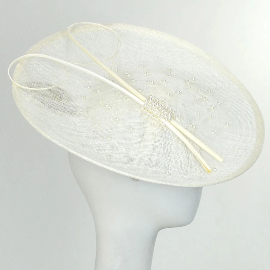 Be fashion-forward with the Catherine Sinamay Fascinator Hat from Scala. The stiff, curved dish features a collection of beautiful pearl decor and curved accents. Additionally, the satin headband is absolutely eye-catching, and nicely compliments the comfortable grosgrain ribbon lining.