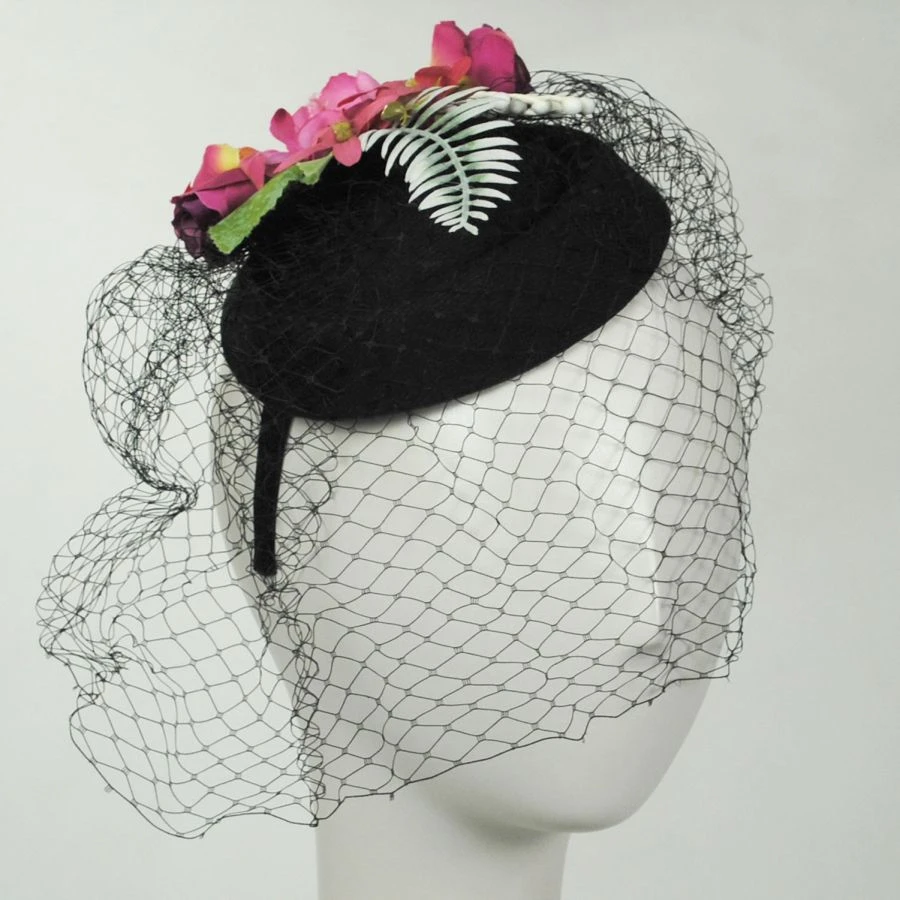 Allude to a garden oasis with the Secret Garden Velvet Fascinator Hat by Jeanne Simmons. The faux floral arrangement adorning the dish base makes us thick of abundant flowers, sunny locales, and benches tucked away behind trees and bushes. The veil adds to the mystery and wonder this fascinator suggests. Comes with an optional satin headband and metal alligator hair clip.